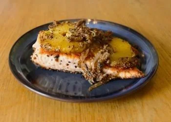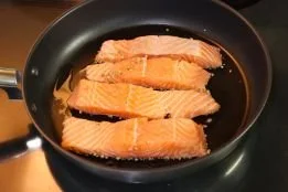 3. In a nonstick frying pan, heat EVO over medium heat. Add salmon pieces, crushed coriander seed side down, and cook for about 3 minutes until bottom is golden brown. Turn salmon over and cook for about another 3 minutes. You want the flesh to be opaque. (see note below). Transfer to a platter.
