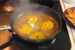 6. Add lemon juice, orange juice, butter, orange slices, and water.